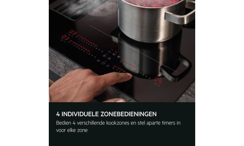 Dankzij 4 individuele zone-bedieningselementen met 9 vermogensniveaus kun je 4 verschillende kookzones individueel bedienen en voor elk afzonderlijke timers instellen. Andere functies zijn boosterfunctie, schuifbediening, kinderslot en automatische afzuigbediening.
