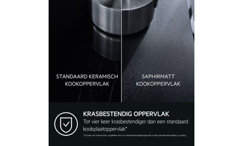 Het SaphirMatt®-glas biedt superieure bescherming tegen krassen in vergelijking met onze standaard keramische kookplaten. De elegante zwarte matte afwerking is bestand tegen vingerafdrukken en vlekken – waardoor jouw kookplaat er langer als nieuw blijft uitzien.