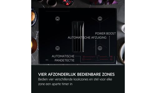 4 individuele zone-bedieningselementen met 9 vermogensniveaus stellen je in staat om 4 verschillende kookzones te bedienen en voor elk aparte timers in te stellen. Andere functies zijn boosterfunctie, DirekTouch, kinderslot en automatische regeling van de afzuiging.