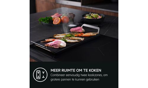 Met de brugfunctie kun je twee aparte kookzones met elkaar verbinden en zo één grote kookzone maken. Zo wordt de warmte gelijkmatig over het hele oppervlak verdeeld, en dat is handig voor grote pannen of een planchagrill.