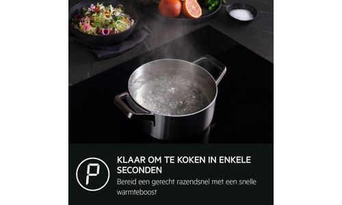 Kookplaat en afzuigkap, verbonden: AEG 5000 inductie met Hob2Hood®. De ventilatorsnelheid wordt automatisch geoptimaliseerd op basis van de warmte van de kookplaat. Profiteer van krachtige afzuiging tijdens het aanbraden en een stillere extractie tijdens het sudderen. Zonder een vinger uit te steken.