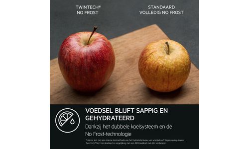 TwinTech® NoFrost heeft een geavanceerd, dubbel koelsysteem voor de koelkast en vriezer. Deze technologie zorgt dat de vriezer vorstvrij blijft en dat er een optimale luchtvochtigheid in de koelkast heerst, om te voorkomen dat voedsel uitdroogt.