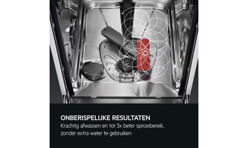 Geniet van vlekkeloze reiniging van de vaat met SatelliteClean®. Deze sproeiarm heeft een drie keer beter bereik dan de standaardnorm. Dankzij de dubbele roterende arm die voortdurend de sproeihoek wijzigt. Het water komt overal. Voor een complete reiniging.