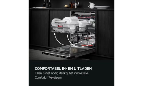 De nieuwe Comfortlift-vaatwasser van AEG is uniek: het is de eerste ter wereld die het onderste rek omhoog kan laten komen. Uw glanzende vaat en pannen worden behoedzaam naar een aangename werkhoogte gebracht; zodat u efficiënter kunt in- en uitladen. Met Comfortlift hebben we wassen in de vaatwasser naar een geheel nieuw niveau getild.